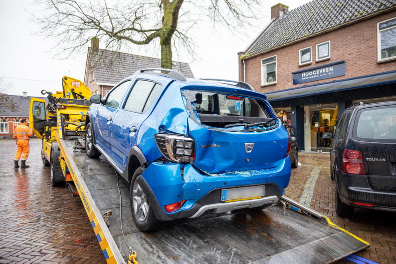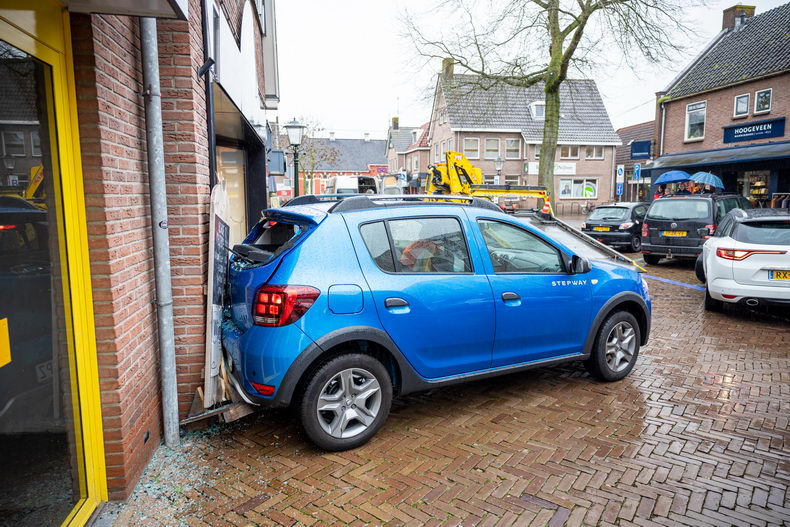 Een automobiliste is vanmiddag tijdens het uitrijden van een parkeerplaats tegen een winkelpui in het centrum van Ommen gebotst. |