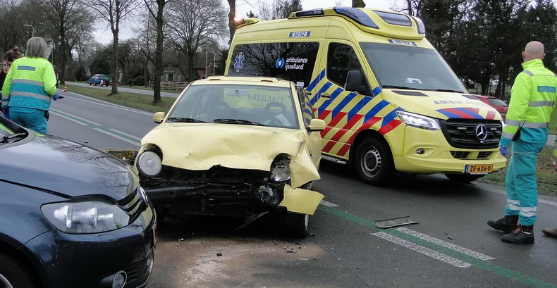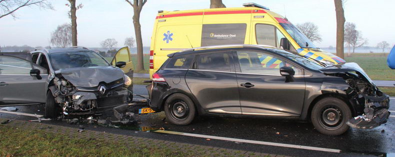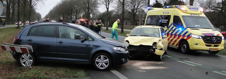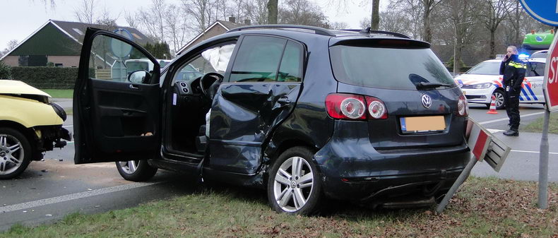 | Twee Volkswagens (een donkerblauwe Golf Plus en een gele Lupo) zijn zaterdagmiddag zwaar beschadigd ten gevolge van een botsing op een oversteek in de de N377 - Oosterhulst ten, oosten van Nieuwleusen. Eén van de inzittenden is in de ambulance behandeld en naar een ziekenhuis vervoerd. Het verkeer werd tussen Balkbrug en Nieuwleusen over de parallelwegen omgeleid. |