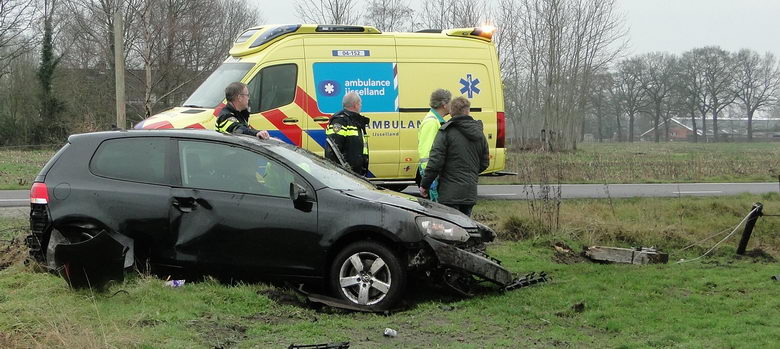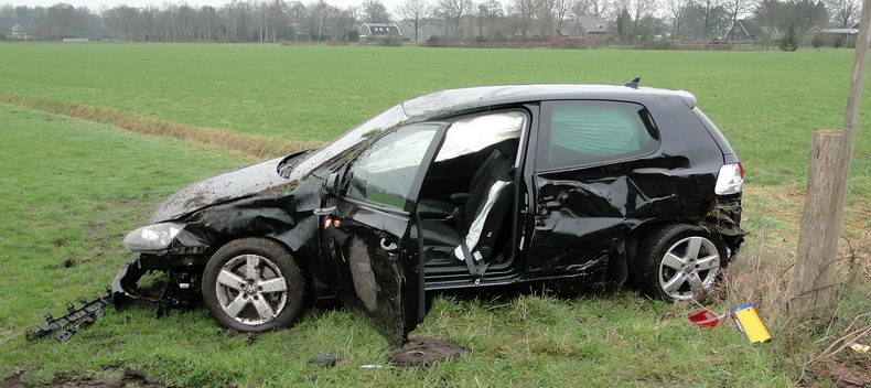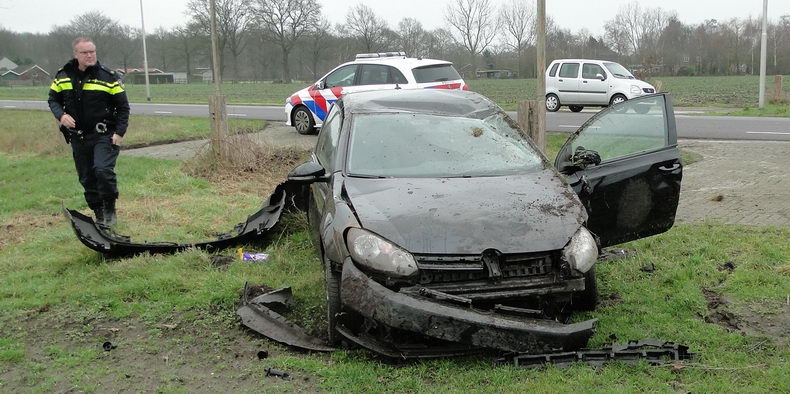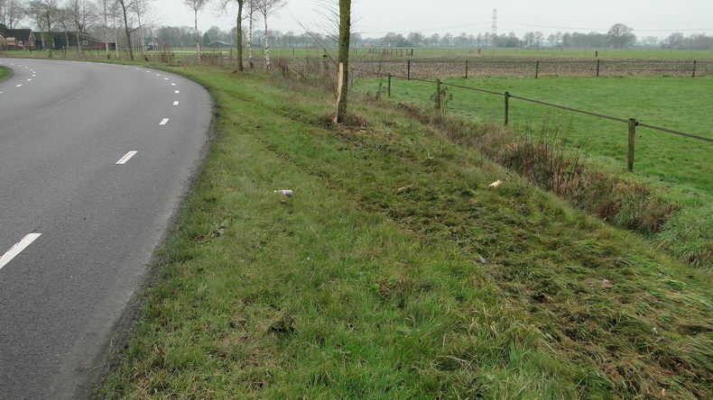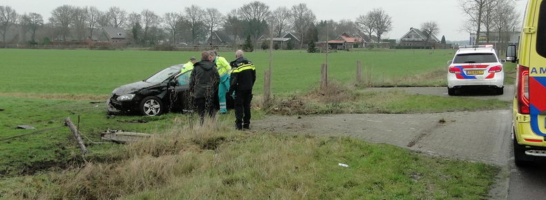 | Zondagmiddag even na half twee werd gemeld dat er een verkeersongeval was gebeurd op de aansluiting van N 377 met de Weverijweg. De lokatie werd kort daarna gecorrigeerd in de aansluiting van de Wevrijweg met de Herenstraat. Er stond een danig gehavende Volkswagen Golf in een weiland, die -zoals uit de sporen viel op te maken- in de laatste bocht van de Weverijweg rechtdoor gegaan was, een boom schampte, de -droge- sloot in dook, over de kop ging, maar toch op zijn wielen tot stilstand kwam. De jonge bestuurder zat versuft in het voertuig, maar werd al gauw door ambulancepersoneel behandeld en kon naar de ambulance lopen. De acht jaar oude Golf was rijp voor de sloop. |