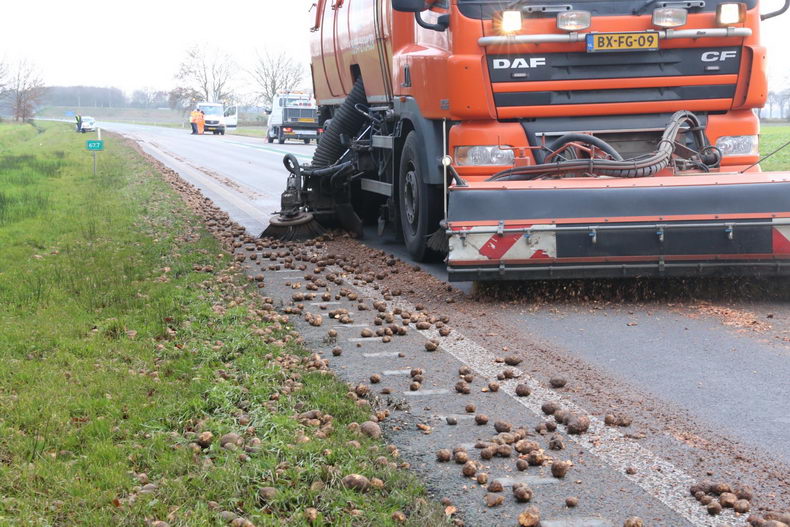 | De proviciale weg N34 is maandagmiddag urenlang tussen de afslagen Emmen-Noord en Exloo in beide richtingen afgesloten geweest, nadat een onbekende vrachtwagen ter hoogte van Klijndijk een lading aardappels verloren was. De weg was glad, omdat de piepers platgereden waren. De pieperpulp werd met behulp van een veegwagen opgeruimd. |