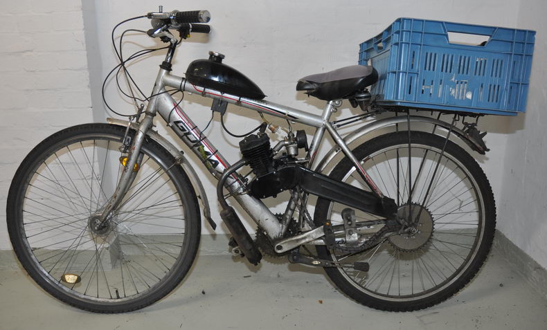 | Politiemensen keken raar op, toen de zaterdag rond 14:30 uur bij de Haselünner Straße in Meppen (D) na de melding van een verkeersongeval een niet-alledaags vehikel ontwaarden. Het bleek te gaan om een mountainbike, die uitgebreid was met onder meer een motor, een benzinetankje en een koppeling en daardoor een kleine motorfiets was geworden. Omdat de “motorfiets” nogal wat gebreken vertoonde en geen goedkeuring had, werd hij in beslag genomen. De bestuurder , die niet over een rijbewijs beschikte en in een voetgangers- en fietserstunneltje reed en daar een voetganger toucheerde, kan rekenen op de nodige processen verbaal. Foto: Polizei |