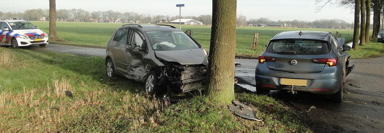 | Een flinke aanrijding op de kruising van de Middeldijk met de Paltheweg en de Bliksweg betekende donderdagmorgen het einde van het aardse bestaan voor een VW Golf Plus en een Opel Astra. Een eik, die aan de kruising stond, kwam er ook niet zonder schade vanaf. De bestuurder van de Golf Plus ging met de ambulance mee voor een nadere controle in een ziekenhuis.. Bergingsbedrijf Wolves mocht het verkreukelde blik ophalen. |