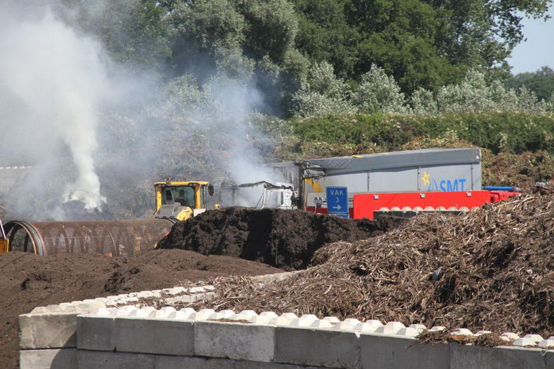 | De brandweer rukte vrijdagmiddag tegen half drie uit naar een groenafvalverwerkingsbedrijf aan de Mossendamsdwarsweg, waar een trekker met oplegger vol groenafval in brand stond. Het vuur sloeg over op een berg groenafval, maar kon tijdig gedoofd worden door het afval uiteen te trekken. De trekker brandde volledig uit, de oplegger, waarvan de lading met een mobiele kraan gelost is, liep zware schade op en moet gesloopt worden. |