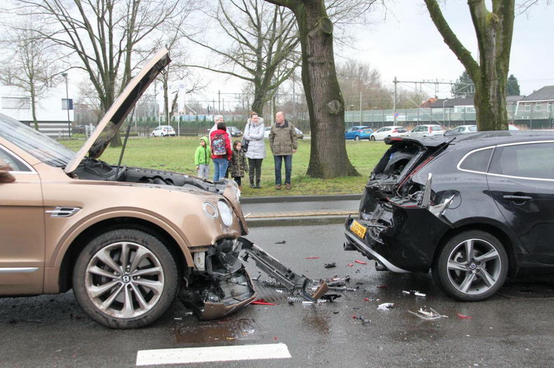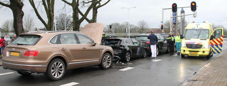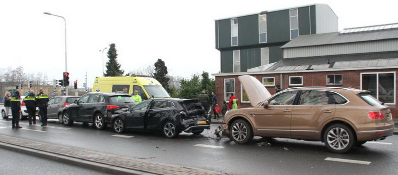 | Vrijdagmiddag rond half twee ontstond er een kettingbotsing -waar zes auto’s flinke schade bij opliepen- voor de verkeerslichten op de Kolthofsingel in Almelo Op zich al opmerkelijk, maar één van de auto’s was een drie jaar oude Bentley Bentayga met een cataloguswaarde van 336.475 Euro en een twaalfcilinder motor. Deze slee -en een ook niet goedkope Audi Q8- liepen zware schade op. Een persoon is naar een ziekenhuis vervoerd. |