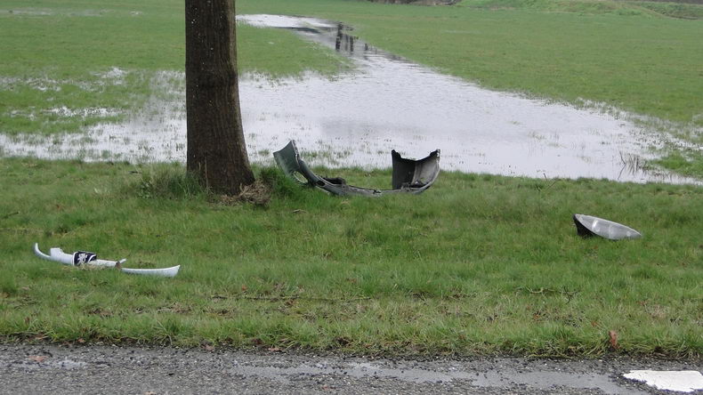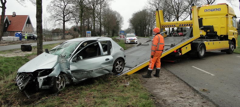 | De bestuurder van een zilvergrijze Peugeot 206 verloor vrijdagmorgen tegen negenen de macht over het stuur op de Dedemsvaartseweg ter hoogte van het einde-bebouwde-kombord op de Dedemsvaartseweg in Ane. De auto kwam in de berm, waar de slippartij gestopt werd door een boom, die de auto ter hoogte van de A-stijl trof en slooprijp maakte. De klap was zo hard dat de accu en wrakstukken van de auto aan de overzijde van de weg terechtkwamen. De automobilist, die versuft was, is voor alle zekerheid met de ambulance naar het ziekenhuis in Hardenberg gebracht.. Berger Autax haalde het autowrak op. |