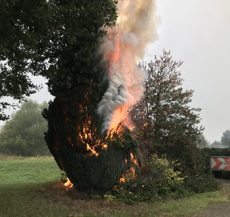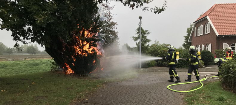 | Maandagmiddag ontdekte een automobilist rook op de rondweg van Neuenhaus. Hij ging op zoek naar de oorzaak en ontdekte dat er aan de Uferstraße een negen meter hoge levensboom (thuja) in brand stond en belde direct het alarmnummer. De brandweer van Neuenhaus werd om 17:51 uur gealarmeerd en rukte met drie voertuigen en 15 man uit. Men wist de vlammen te doven voordat omringend groen ook in vlammen opging. De politie stelde een onderzoek in en zoekt getuigen, met name de bestuurster van een zilverkleurige Volkswagen. Zij heeft vermoedelijk gezien dat enkele jongeren wegrenden. Verder werd de brand door een automobilist gefilmd die op de Weidenstraße stond. Hen wordt verzocht contact op te nemen met de politie in Emlichheim: 0049 5943 92000. |