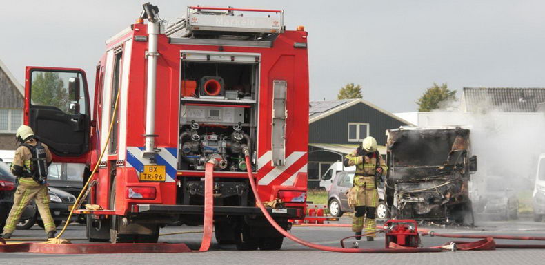 | Woensdagmorgen tegen half elf rukte de brandweer uit naar autobedrijf Dijkstra aan de Rijssenseweg in Markelo, waar een kampeerauto in brand was gevlogen. De dikke zwarte rookpluim was in de wijde omgeving zichtbaar. De brandweer heeft nog bijtijds twee gasflessen in veiligheid gebracht. De camper kan als verloren worden beschouwd. De oorzaak van de brand is een technisch mankement. |