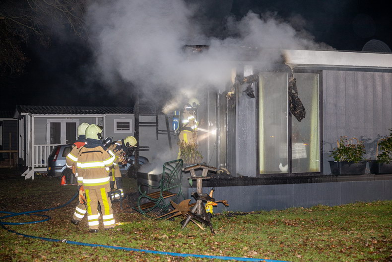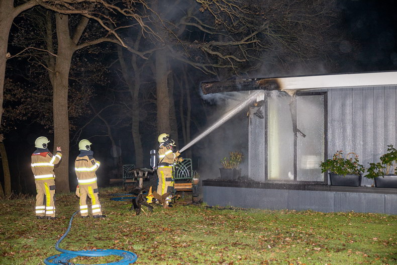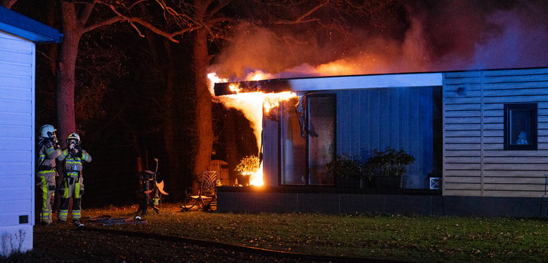 | Een chalet op Camping ’t Voshuus aan de Dalmsholterweg in Giethmen is in de nacht van maandag op dinsdag zwaar beschadigd door brand Een bewoner van een nabijgelegen chalet hoorde rond kwart voor drie ondanks de vrij hevige regenval het geknetter van de brand. Hij ontdekte de brand op het achterste veld van de camping en seinde de hulpdiensten in. Bij aankomst van de brandweer woedde de brand op het ‘terras’ aan de achterkant van het bouwwerk. De brandweer wist het vuur snel te bedwingen, maar de schade is aanzienlijk Er was niemand aanwezig in het chalet, en volgens andere bewoners van het veld wordt het vrijwel hagelnieuwe verblijf op het moment niet actief bewoond. Wat de exacte oorzaak van de brand is zal nader onderzoek moeten uitwijzen. Brandstichting wordt niet uitgesloten. Amper een jaar geleden -op 8 oktober 2020- ging op exact hetzelfde veld ook al een chalet in vlammen op. |