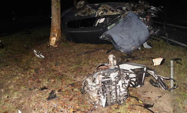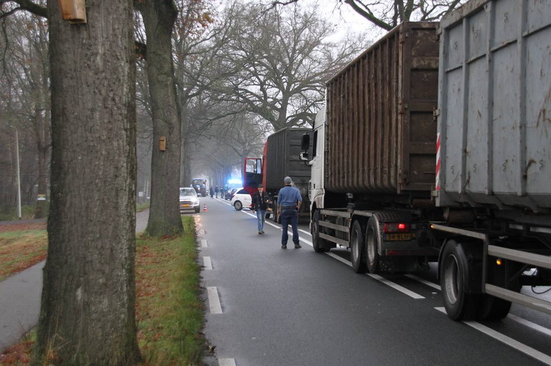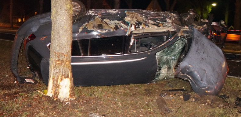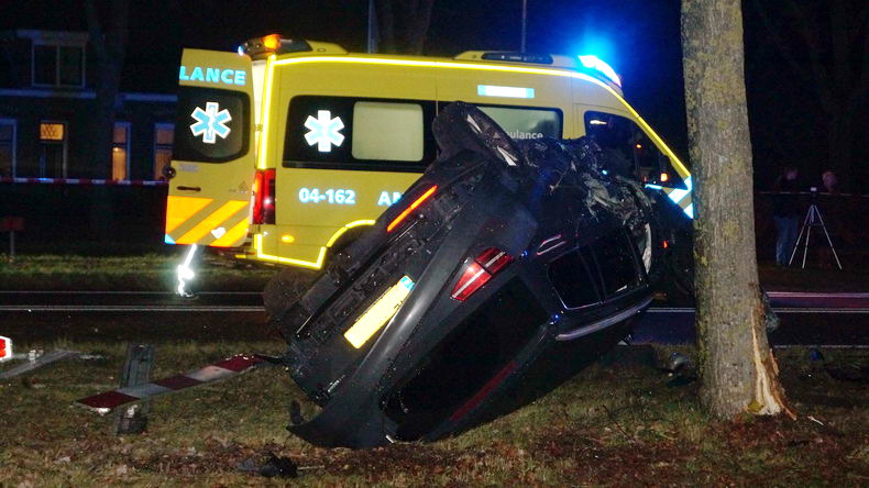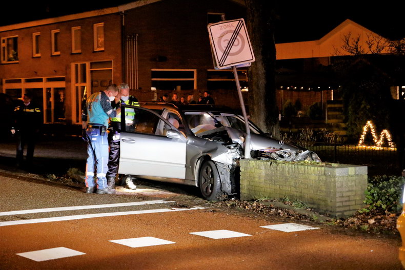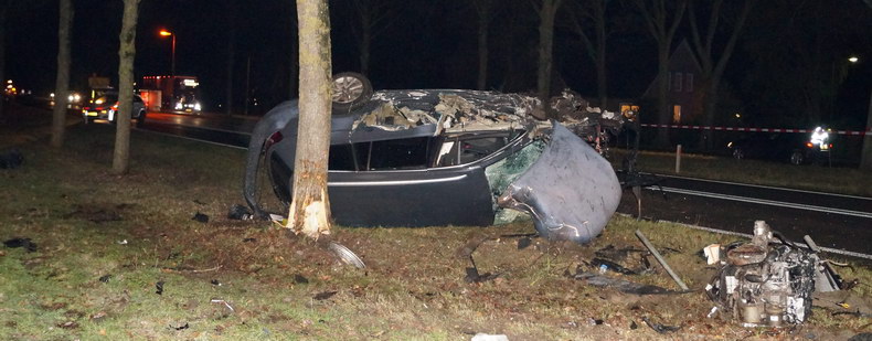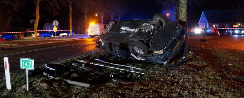 | De temperatuur zakte aan het eind van de middag iets onder het vriespunt, terwijl asfalt veelbetekenend glinsterde: vaart minderen, vooral voor bochten! Het aantal ongevallen viel erg mee, maar tegen kwart voor acht donderdagavond werd een ongeval letsel gemeld op Den Hulst (N377) tussen Balkbrug en Nieuwleusen, bij hectometerpaal 14.7. Het verkeer werd een einde daarvoor al in beide richtingen de ventweg op gewezen en het zag blauw van de zwaailichten. Aan de noordzijde van de N377 lag iets tegen een boom wat een auto geweest moest zijn, voordat het aan de overzijde van de weg enkele bomen, hekken en verkeerborden met de grond gelijk maakte. De slippartij eindigde tegen een boom, maar toen was de wagen al talloze onderdelen en het complete motorblok verloren. De bestuurder klauterde op eigen kracht uit het wrak -zij het met rugpijn- en blies op verzoek van Oom Agent op het pijpje -een keurige P. |