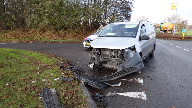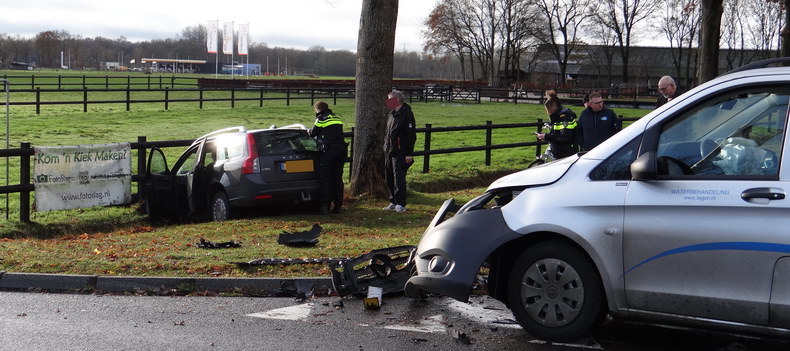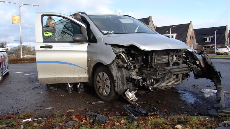 Rond kwart voor elf donderdagmorgen liepen een Volvo V50 en een Mercedes Vito zware schade op, toen ze elkaar hard raakten op de kruising Weverijweg - MNoesheokweg - Bonte Weverstraat. De bestuurder van de Vito, die de kruising over wilde steken naar de Moeshoekweg, zag daarbij deVolvo die op de Weverijweg naderde, over het hoofd, en de aanrijding was het gevolg. De Volvo stationwagen kwam met zijn neus in een bermslootje tot stilstand naast een banner met de tekst "Kom een kiek maken". |