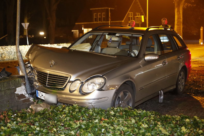 | Duitse auto klapt op de Europaweg in Nieuw-Schoonebeek tegen stenen muurtje |
