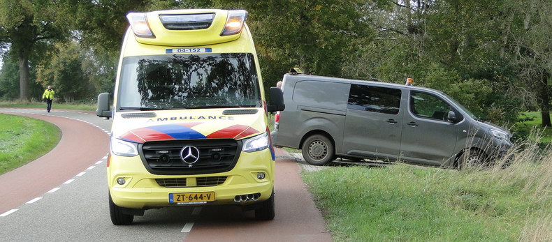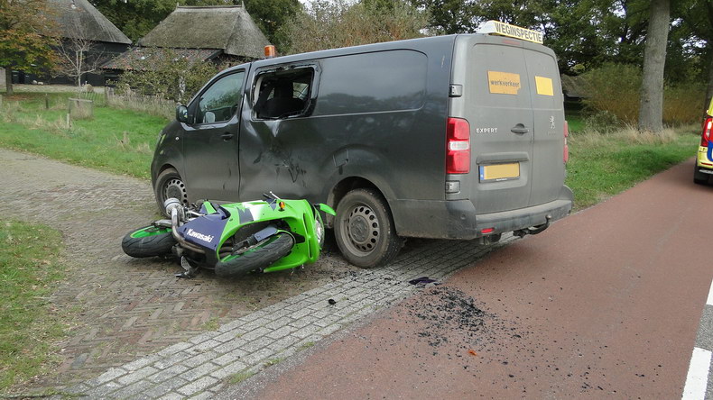 | Op goed een kilometer van de plaats waar vrijdagmiddag een auto kantelde na een aanrijding met een boom werd zaterdagmiddag even na enen opnieuw om een ambulance gevraagd vanwege een aanrijding; dit keer op de Den Kaat. Een motorrijder was tegen de linker zijkant van een bestelwagen gereden, die afsloeg naar het erf van een boerderij. De gewonde motorrijder is per ambulance naar een ziekenhuis gebracht. De Peugeot Expert bestelbus en de Suzuki Ninja ZX-6R motor waren flink beschadigd. |