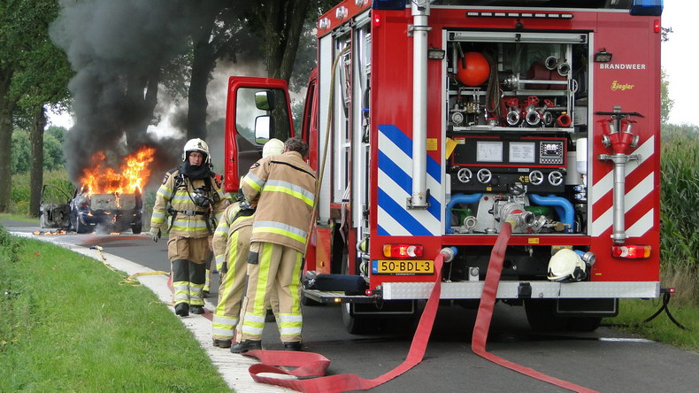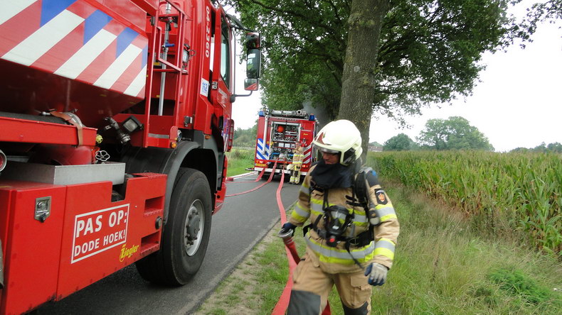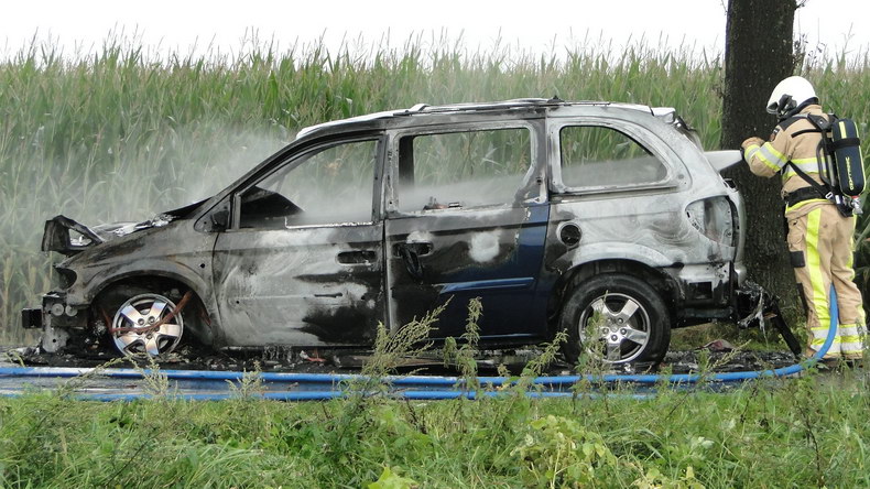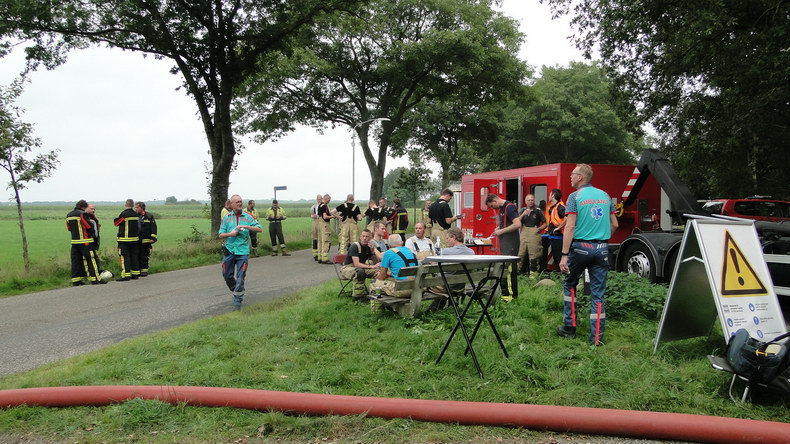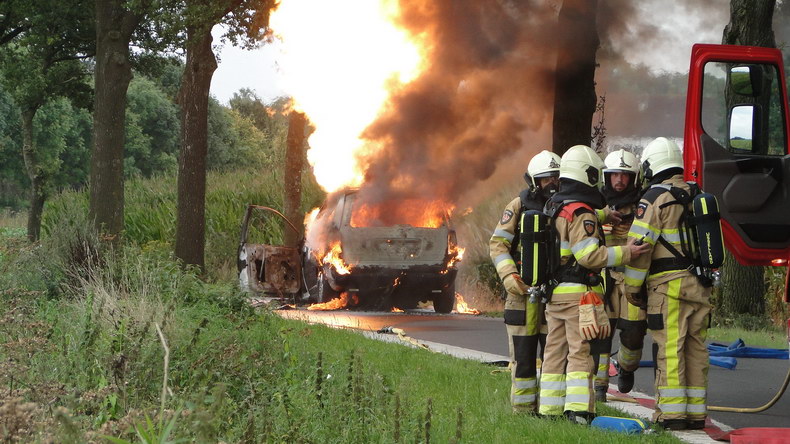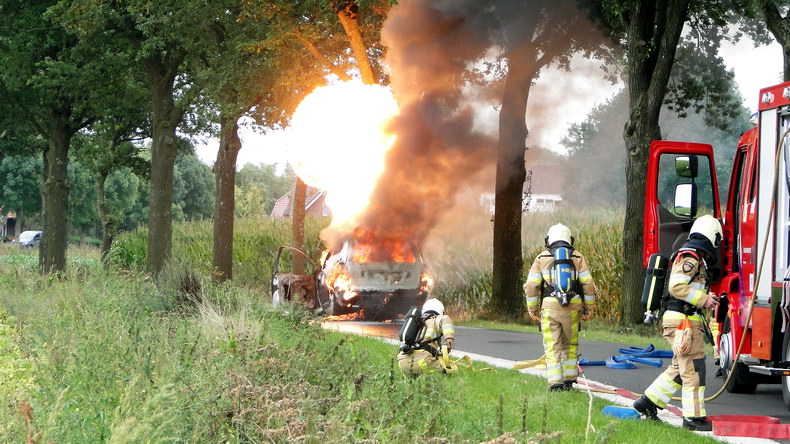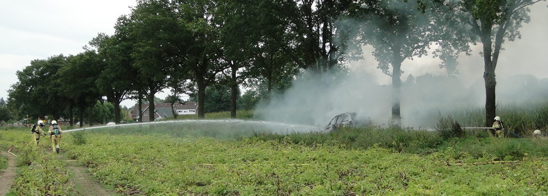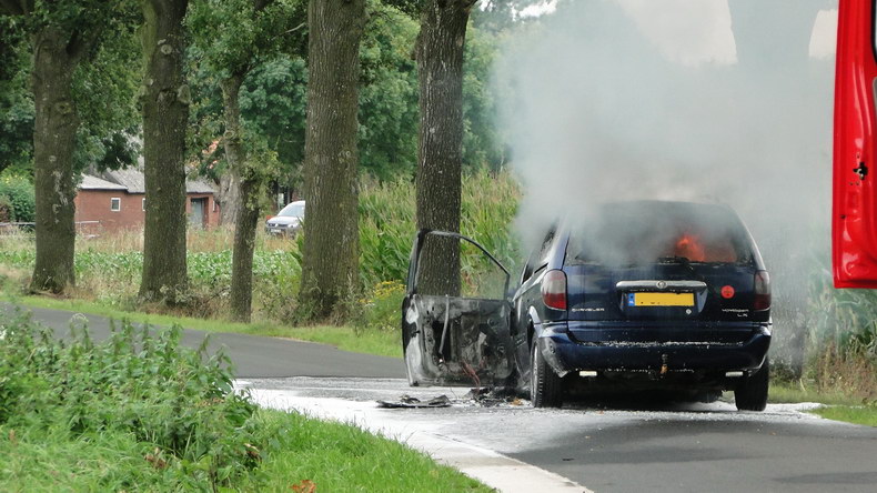 | De brandweer van Gramsbergen rukte dinsdagmiddag uit naar de weg Vilsterborg in Holtheme, waar een auto in brand stond. Het lukte net niet de brand met de voorraad water uit de tankautospuit volledig te blussen, maar terwijl de tankwagen uit Hardenberg onderweg was, laaiden de vlammen weer op. Er volgde een reeks grotere en kleinere explosieve verbrandingen toen de veiligheidsklep LPG liet ontsnappen. Toen er weer water was, moest er dus voldoende afstand gehouden worden en de mannen moesten vanuit dekking blussen. De auto -een Chrysler Voyager die net van de garage was opgehaald- brandde volledig uit. Berger Autax mocht de trieste restanten op komen halen... |
