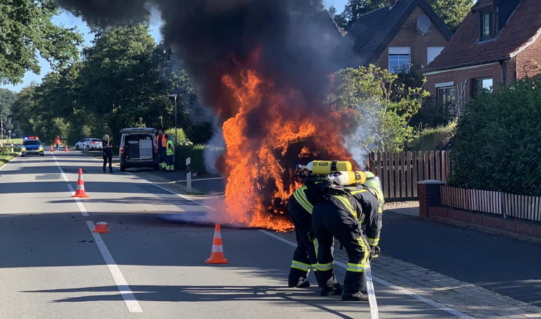 | De veertigste uitruk dit jaar van de brandweer Neuenhaus betrof een autobrand. Even na half negen ontdekte een uit Nederland afkomstige automobiliste, dat er iets niet in de haak was met haar BMW SUV. Na een rotonde in de Vechtetalstraße stopte ze rechts van de weg, waarop rook en vlammen onder de motorkap vandaan kwamen. Pogingen van omstanders de brand te doven met poederblussers mislukten, omdat de motorkap niet open ging. De brandweer werd gebeld, maar toen die arriveerde, stond de auto al volledig in de hens. Toen de ergste vlammen verdwenen waren, werd met schuim nageblust. Nadat het wrak opgehaald was en de straat schoongemaakt werd de weg weer vrijgegeven. |