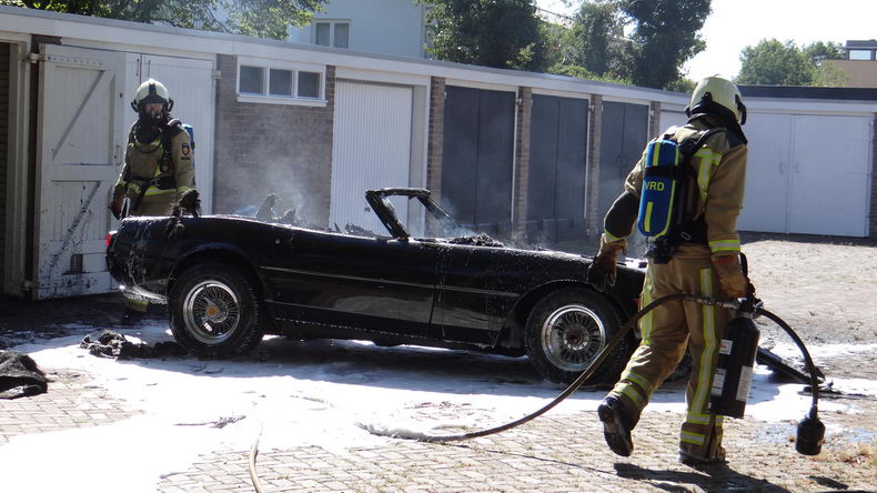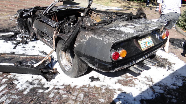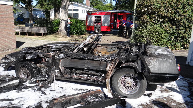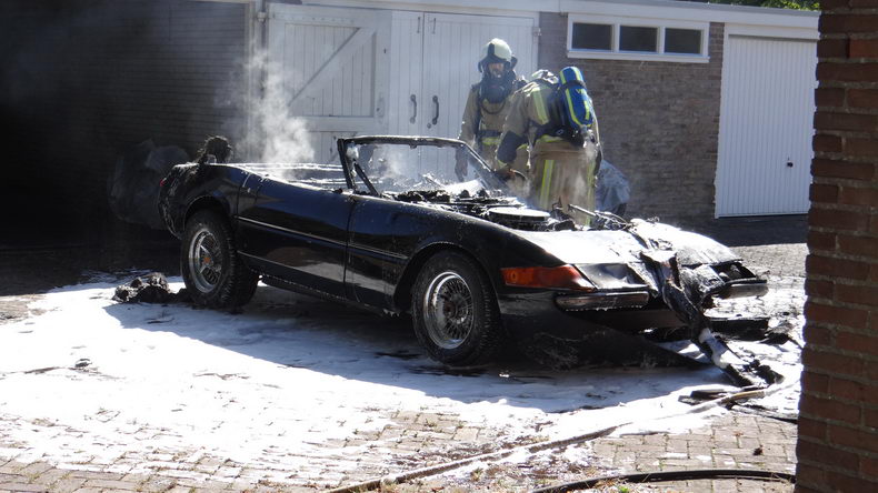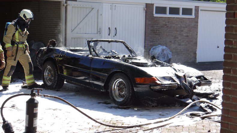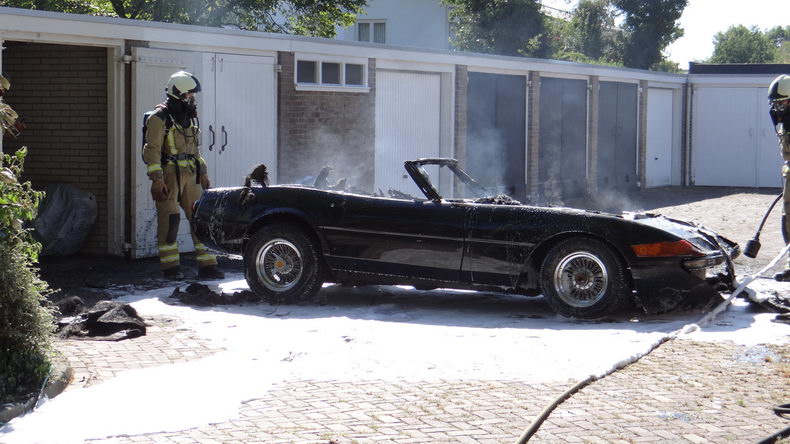 | De eigenaar van een replica-Ferrari die hij enkele jaren geleden met veel moeite had verworven, wilde zijn opmerkelijke bolide verkopen, omdat hij geen tijd had om de de wagen te steken. Er wasal een aspirant-koper voor, maar om een beter beeld van de sportwagen te kunnen geven , werd besloten de auto op deze zonovergoten vrijdag uit de garagebox aan het Meijerswegje te rijden voor een fotosessie. Maar toen hij de replica (chassis van een Chevrolet Corvette; carrosserie van een Ferrari Daytona Spider) meerdere keren probeerde te starten, lukte dat niet. Sterker nog: er brak brand uit onder de motorkap! Snel werd de sportwagen uit de garage geduwd, maar toen de brandweer op de plaats des onheils arriveerde, stond de auto helaas al over de volle lengte in de hens. |