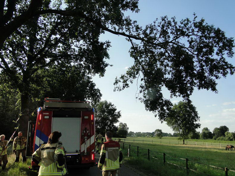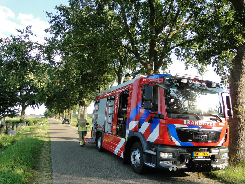 Aan de Oeverlandenweg is donderdag aan het einde van de middag een tractor volledig uitgebrand. De bestuurder had net een ronde gedaan op zijn land met de zwadhark en was op weg naar een ander perceel toen plots vlammen onder de motorkap vandaan kwamen. De man en een klein kind konden tijdig de cabine verlaten en alarmeerden de brandweer. De Staphorster brandweer kon helaas de tractor niet meer redden. De tweeduizend liter water aan boord van de brandweerauto was niet voldoende om de brand te blussen waarop assistentie werd gevraagd van de brandweer Meppel om met de tankwagen ter plaatse te komen. Met deze extra capaciteit kwam er al snel een einde aan de vlammen. Bergingsbedrijf Hooikammer werd via de verzekeringsmaatschappij ingeschakeld om de restanten van de enkele maanden oude Steyr van het beschadigde wegdek te halen. |