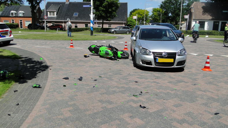 | De bestuurder van een Kawasaki Ninja ZX-10R 1000 cc motor liep zaterdagmiddag letsel op, toe hij op de Vaart in Ane in de richting van Gramsbergen reed en er onverwachts een VW Golf voor hem de kruising met de Anerveenseweg op reed. De zware motor klapte tegen de rechterzijde van de Golf, waarbij beide voertuigen flinke schade opliepen. De motorrijder is met onder meer letsel aan een sleutelbeen naar een ziekenhuis vervoerd. De inzittenden van de Volkswagen bleven ongedeerd. |