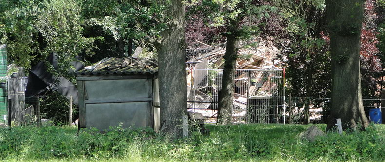 | Van de woning aan de Johannes Plasweg, waar zondagmorgen rond kwart over zes brand ontdekt werd, is alleen een grote berg puin overgebleven.. Het pand was zowel vanaf de Europaweg en de Johannes Plasweg nauwelijks te zien. |