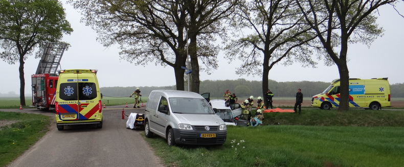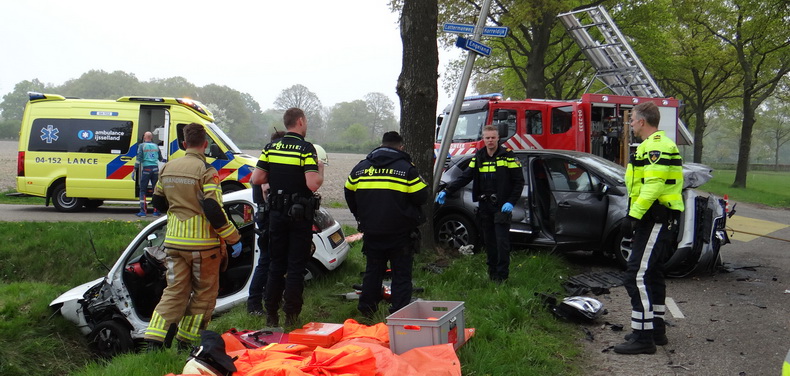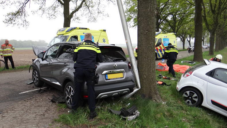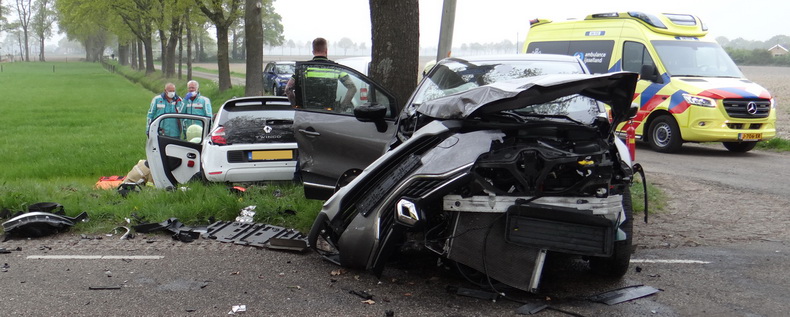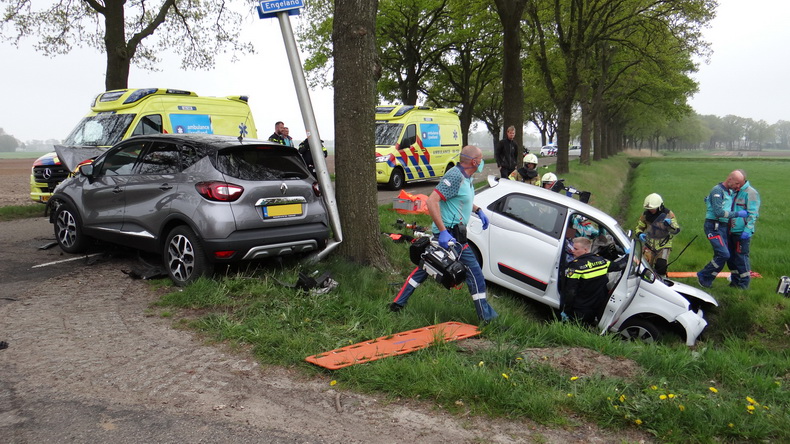 Tegen elven woensdagmorgen maakten twee Renaults onplezierig hard kennis met elkaar op de kruising Engeland - Lottermanweg - Korreldijk in Anevelde (gemeente Hardenberg). Na de confrontatie kwam een witte Renault Twingo -waar twee vrouwen in zaten- met de neus in een greppel tot stilstand; de andere Renault (een Captur) - eveneens bestuurd door een vrouw- klapte na de botsing met de achterzijde tegen een lantaarnpaal, die daardoor halverwege knikte. |