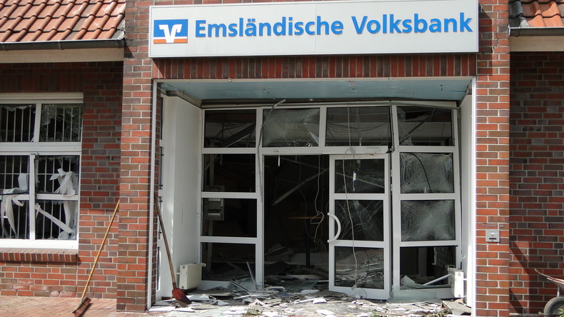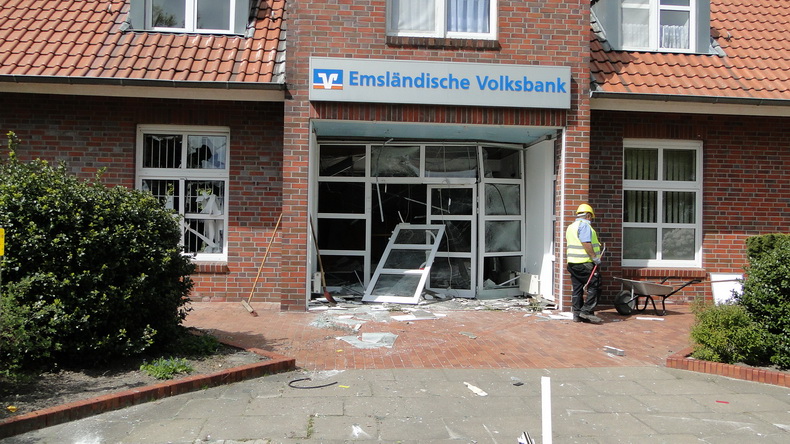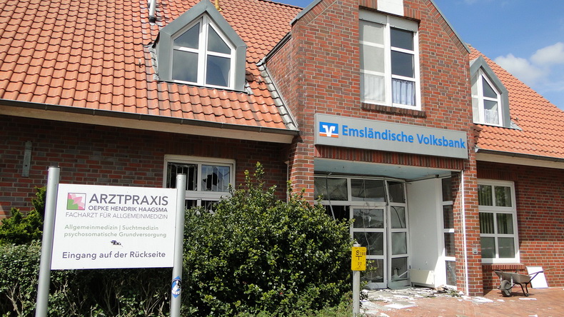 | De voorzijde van de vestiging van de Emsländische Volksbank aan de Franziskusstraße in Schóninghsdorf (nabij Klazienaveen) is rond 01:05 uur in de nacht van dinsdag op woensdag in een puinhoop veranderd door een plofkraak op een geldautomaat. Brokstukken en gesprongen ruiten lagen to op de rijbaan. De drie bewoners kwamen er zonder kleerscheuren vanaf, maar ze moesten hun woning wel uit. De huisartsenpraktijk,die ook in het gebouw is gevestigd, is door de explosie volledig verwoest, zoals blijkt uit de ter beschikkuing gestelde foto's |