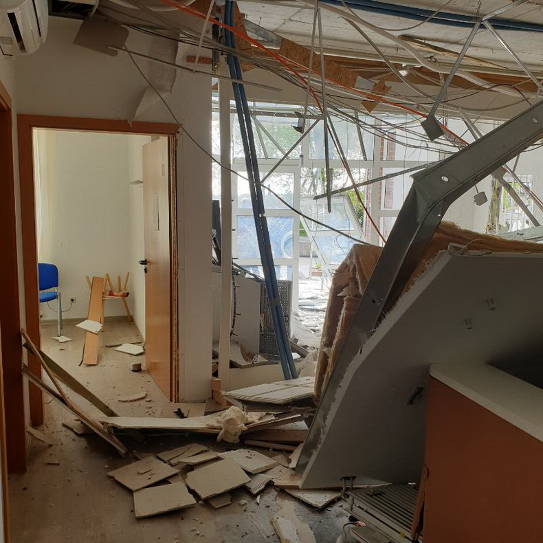 Foto's hierboven: ook de in het gebouw gevestigde huisartsenpraktijk liep immense schade op ten gevolge van de ontploffing |