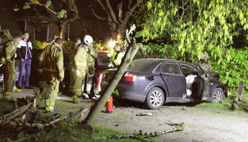 | Vrijdagavond raakte op de Steenbergen in Zuidwolde een auto uit de koers en kwam in de tuin van een woning tegen een geparkeerde auto tot stilstand, na enkele bomen hard te hebben geraakt. De twee inzittenden kwamen met de schrik vrij. De Audi liep zware schade op. |