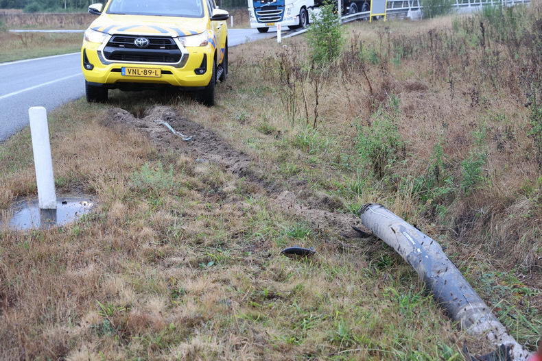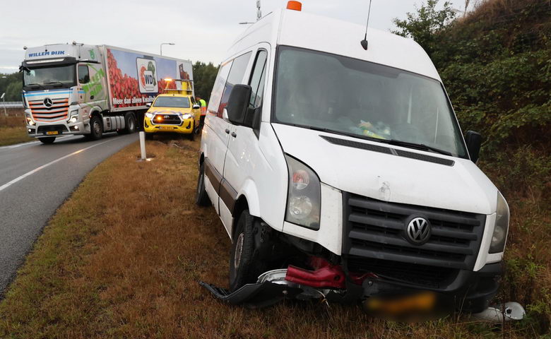| Bestelbus slipt op verkeersplein Gieten en ramt lichtmast uit de grond |