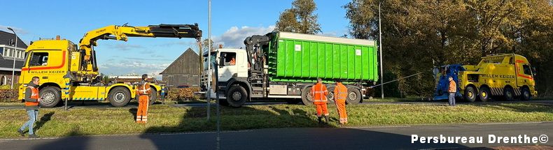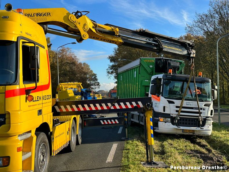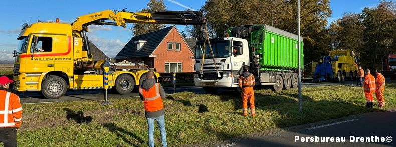 Vrijdagmorgen is een vrachtwagen van een afvalverwerkingsbedrijf in de berm geraakt op de Ing W.I.C van Veelenweg, de N379. Getuigen verklaarden dat de vrachtwagen een slingerende manoeuvre had gemaakt en daarna vast kwam te zitten in de bermsloot aan de linkerzijde van de weg. Bij dit ongeval waren geen andere voertuigen betrokken. Tijdens de berging, door Willem Keizer uit Stadskanaal, was de weg tijdelijk afgesloten. De chauffeur kwam met de schrik vrij. |