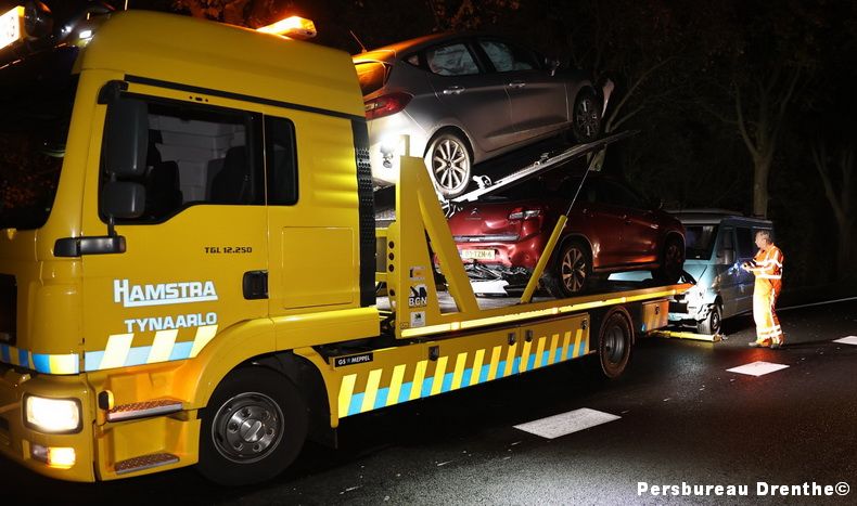 Op de N34 tussen Annen en Gieten zijn vanavond rond 18:40 uur drie auto's op elkaar gebotst. Er zijn meerdere ambulances ter plaatse om de inzittenden te controleren. Volgens een getuige wilde de bestuurder van de rode auto keren op de N34 vanwege het nemen van een verkeerde afslag. De inzittenden van de rode auto moesten naar Assen maar namen de afslag naar Annen. Na controle in de diverse ambulances kon iedereen hun weg vervolgen. De weg was enige tijd in de richting van Annen afgesloten. Verkeer richting Gieten werd over de parkeerplaats Haverlanden geleid. Berger Hamstra uit Tynaarlo heeft de drie beschadigde voertuigen geborgen. |