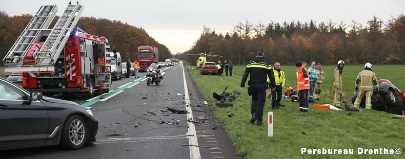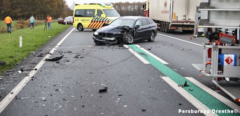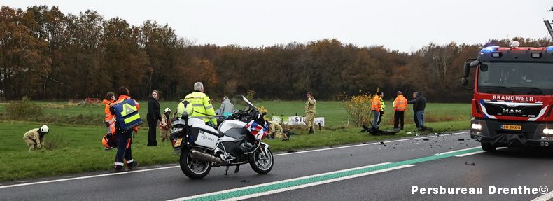 Bij een ongeluk op de N34 ter hoogte van Anloo is een 37-jarige vrouw uit Groningen gewond geraakt. Het slachtoffer is naar het ziekenhuis gebracht, Een jongetje wat bij haar in de auto zat raakte niet gewond evenals de bestuurder van de andere auto. Er waren twee auto's bij het ongeluk betrokken. Een daarvan kwam tot stilstand op de weg, de ander in een greppel. Meerdere ambulances, een traumahelikopter en de brandweer van Annen kwamen ter plaatse. De weg, die bezaaid ligt met brokstukken, werd afgezet tussen Gieten en Anloo. De politie deed onderzoek naar de oorzaak van het ongeluk. Hierdoor was de N34 op dat baanvak geruime tijd afgesloten. Berger Hamstra heeft beide voertuigen geborgen. |