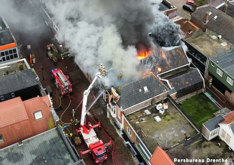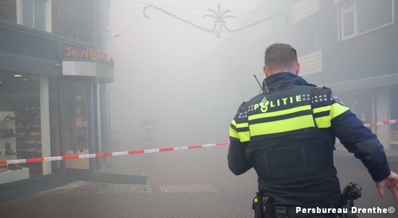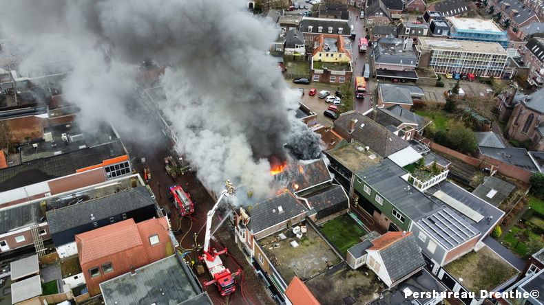 In het centrum van Coevorden is vanmiddag brand uitgebroken. Het vuur zou zijn ontstaan in een woning boven een winkel aan de Friesestraat. Vanwege de enorme rookontwikkeling werd door de politie de gehele straat afgezet en werd niet veel later een NL-Alert uitgegeven. Hierin werd verzocht om bij hinder ramen en deuren gesloten te houden. De brandweerkorpsen van Coevorden, Schoonebeek, Zwinderen, De Krim, Noordwijk, Hoogeveen en Emmen werden verzocht te komen naar de brand welke ondertussen was opgeschaald naar grote brand. Vanwege de uitslaande brand werd er Grip-1 afgegeven wat voor de hulpdiensten het makkelijker maakt om met elkaar te communiceren. Vanuit een speciale CoPI container (commando plaats incident) werden de vele manschappen aangestuurd en konden de nodige maatregelen worden getroffen. De brand zou de volledige 1e en 2e verdieping van de woning in de drukke winkelstraat hebben verwoest. Via een zoldertje zou de brand zijn overgeslagen naar naastgelegen pand. Het centrum van de stad is volledig afgesloten. |