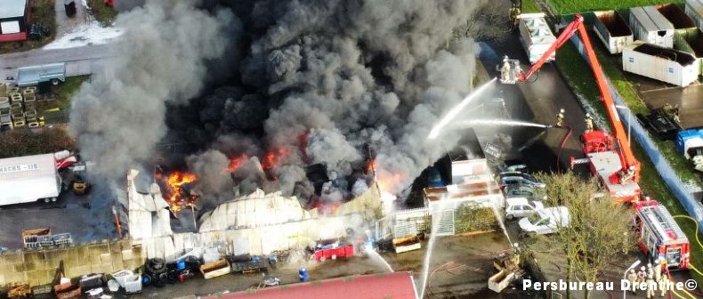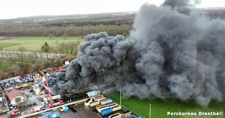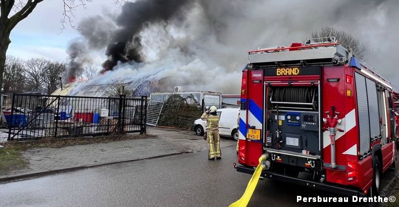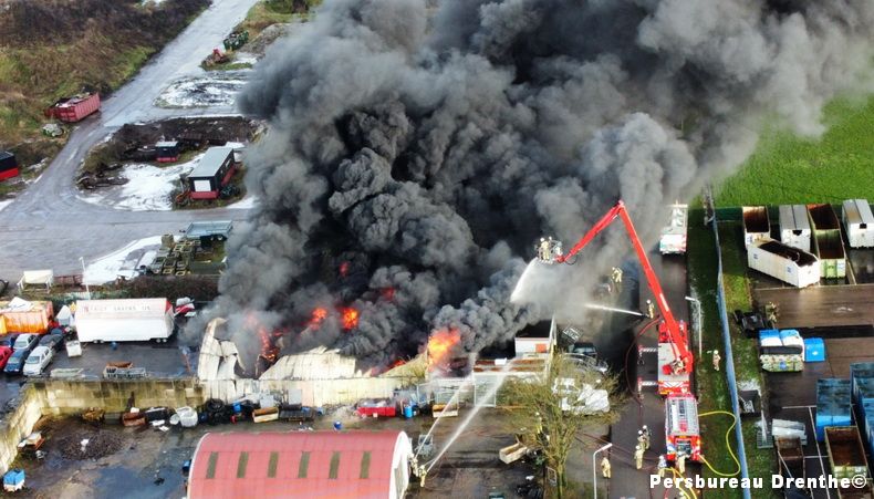 In een Romneyloods van een autosloperij aan de Fokkerstraat op bedrijventerrein De Wieken in Hoogeveen is maandagmiddag rond half twee brand uitgebroken. Hoewel de lokatie van de brand in het alarm werd vermeld als afvalverwerkingbedrijf Renewi, bleek al snel dat die lokatie onjuist was. De enorme zwarte rookwolken waren tot in de verre omtrek te zien. Er werd dan ook een NL-Alert afgegeven en de Fokkerstraat werd door de politie afgesloten. |