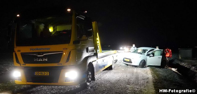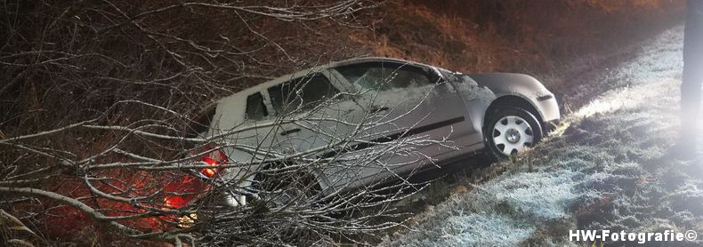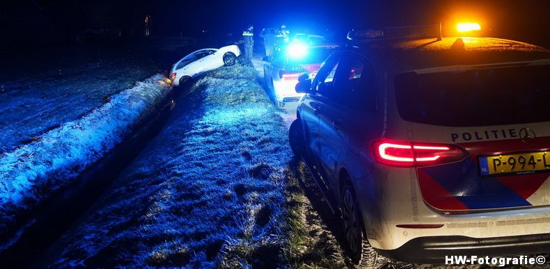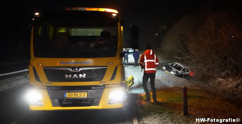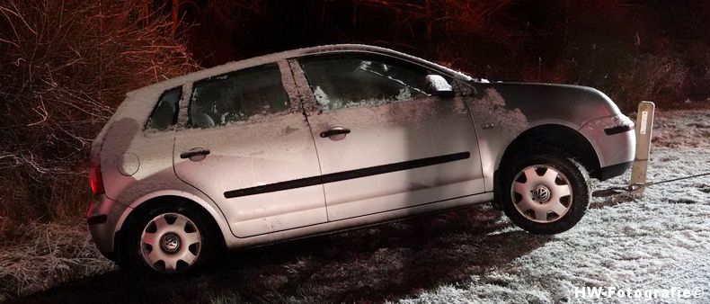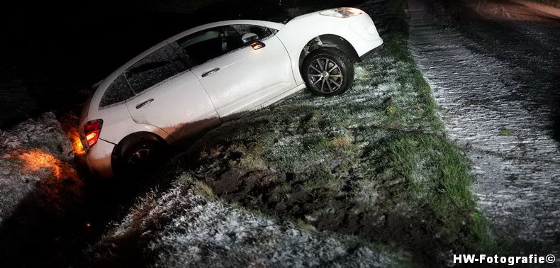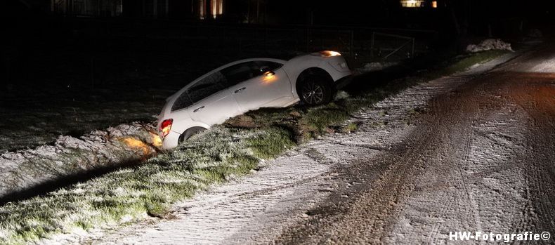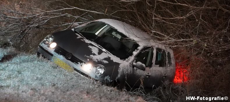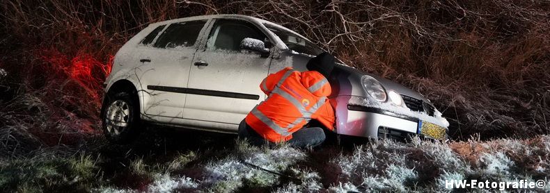 | Niet veel verder, op de N377, was eveneens een auto van de weg geraakt. Hier reed een automobilist vanuit Hasselt richting de Lichtmis maar werd na de bocht bij ‘t Rakkien bijrijder van zijn eigen auto. De auto gleed van de weg en kwam in een greppel tot stilstand. Ook hier kwam de bestuurder er zonder kleerscheuren vanaf. Bergingsbedrijf Hooikammer bood ook hier uitkomst en trok de Volkswagen zonder problemen uit de greppel. Na een korte inspectie mocht ook deze weggebruiker zelf zijn koers vervolgen. |