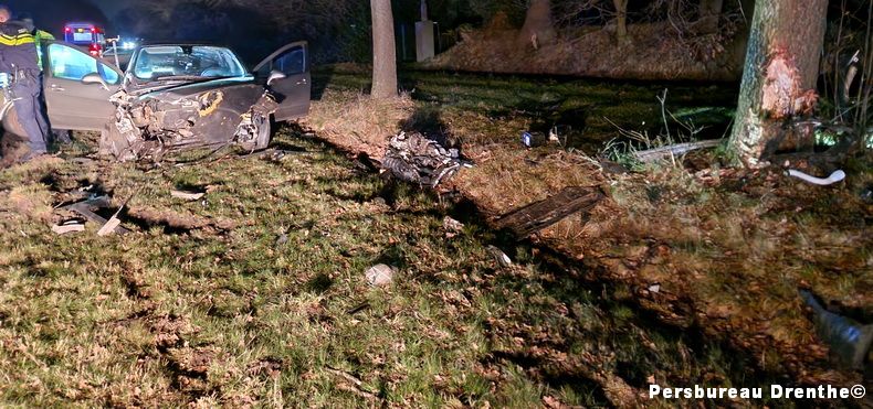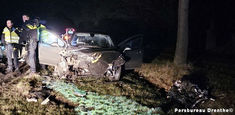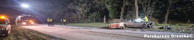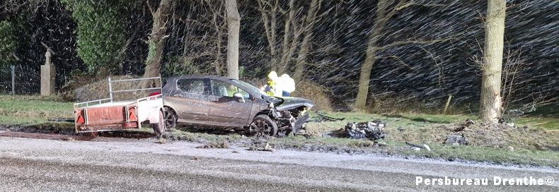 Een automobilist is donderdagavond tegen een boom langs de Asserweg in Hooghalen gebotst. Bij aankomst van de hulpdiensten bleek dat er niemand in of rondom het voertuig aanwezig was. De hulpdiensten zijn daarom met honden en met een warmtebeeldcamera op zoek geweest naar de bestuurder. De auto met aanhanger botste tegen een boom waarbij het motorblok compleet uit het voertuig werd geslagen. De vele brokstukken lagen over een ruime afstand verspreid. Een berger heeft het voertuig en de aanhanger afgevoerd. |