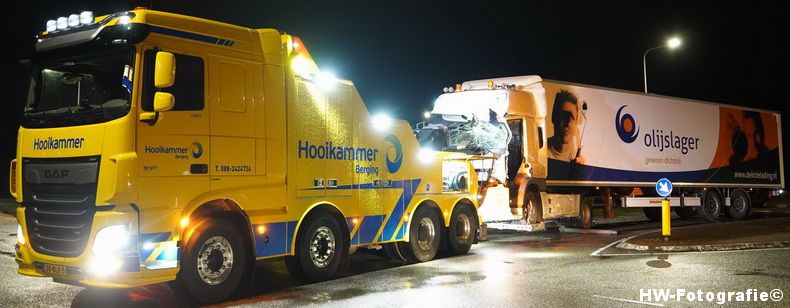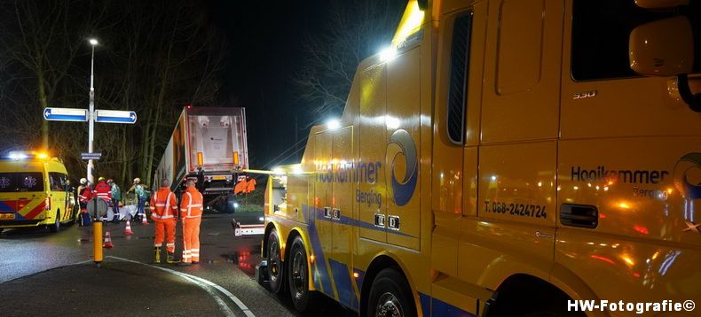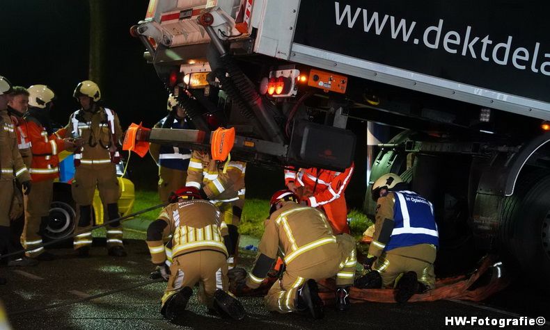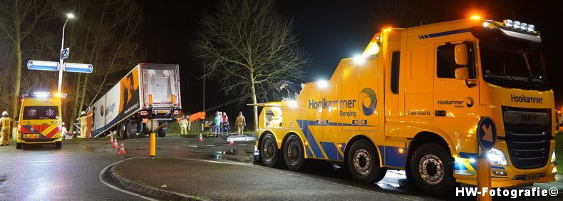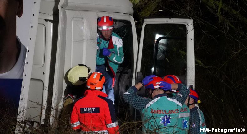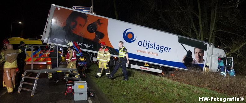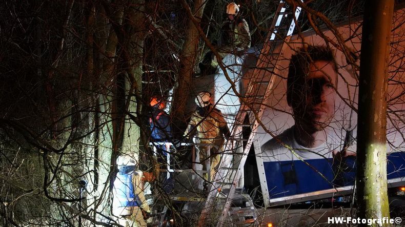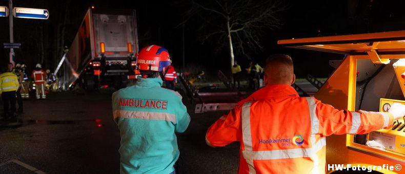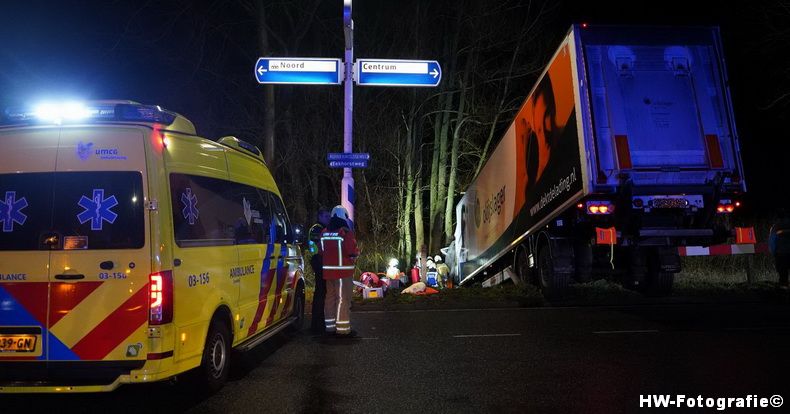 Bij een eenzijdig ongeval op de Ruinerwoldseweg is donderdagavond een vrachtwagenchauffeur gewond geraakt. De man reed met zijn vrachtwagencombinatie naar het bedrijf waar hij werkt maar schoot door nog onbekende oorzaak op de T-splitsing van de Eekhorstweg met de Ruinerwoldseweg rechtdoor en kwam in de bosschage tot stilstand tegen een boom. De bestuurder raakte hierbij bekneld en moest met spoed uit zijn benarde positie worden bevrijd. De hulpdiensten hielden kort overleg zodat de bevrijding zo snel mogelijk kon plaatsvinden. Er waren twee opties; Enkele bomen wegzagen, maar hiervoor moest het treinverkeer worden stilgelegd en de bovenleiding spanningsloos worden gemaakt of de gehele combinatie achteruit trekken. Voor het laatste plan werd gekozen omdat dit de snelste zou zijn. Met spoed werd het zware bergingsvoertuig van bergingsbedrijf Hooikammer opgeroepen . Ondertussen was het mobiel medisch team ook aangekomen. Vanwege enkele flinke buien op de vliegroute werd besloten om in plaats van met de traumahelikopter maar met de auto ter plaatse te gaan. De chauffeur werd stabiel gemaakt voor de reddingsoperatie. Langzaam werd de vrachtwagencombinatie van de bomen weggetrokken zodat er voldoende ruimte was om de chauffeur uit de beschadigde cabine te halen. Nadat de man enige tijd in een ambulance werd verzorgd werd uiteindelijk de rit richting het ziekenhuis ingezet. Zijn toestand is onbekend. De brandweer heeft voor de veiligheid de bomen omgezaagd zodat deze niet op het spoor konden vallen. Het treinverkeer was uit voorzorg al stilgelegd vanwege de optie voor het bevrijden van de chauffeur. Na deze werkzaamheden was alles weer veilig en kom het treinverkeer weer worden hervat. De ingezette brandweerkorpsen van Meppel en Steenwijk keerden na het opruimen van het materieel naar de kazerne voor een nabespreking. De vrachtwagen werd door bergingsbedrijf Hooikammer meegenomen naar het depot in Staphorst en zal morgen worden overgebracht naar een garage. Rond middernacht waren alle werkzaamheden klaar en kon de weg weer worden vrijgegeven. |