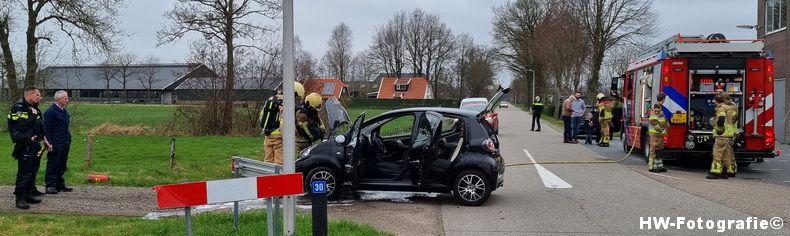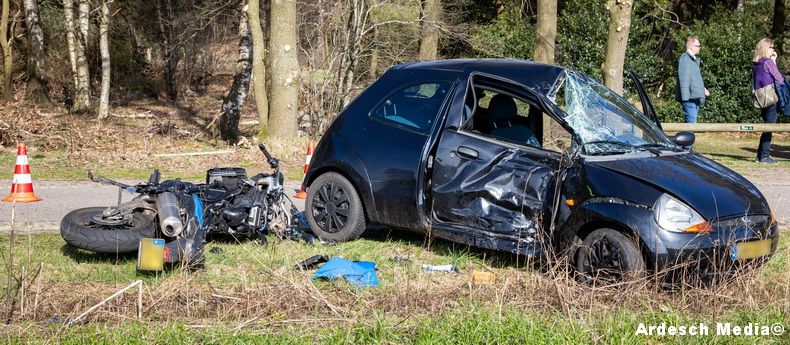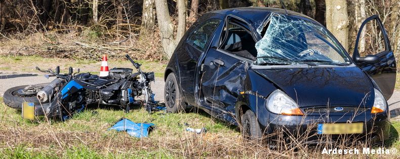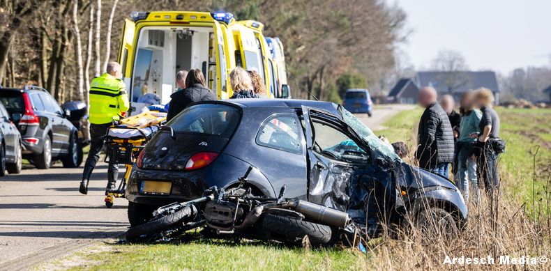 De twee opzittenden van een motor zijn vanmiddag ernstig gewond geraakt nadat ze in het buitengebied tussen Lemele en Lemelerveld in botsing kwamen met een auto. Het ongeval vond rond half twee plaats op de Zonnebloemweg. De motorfiets reed op die weg in de richting van Lemele. Een automobiliste die naast de weg geparkeerd stond bij een natuurgebied wilde daar wegrijden, en keren om in de richting van Lemelerveld te gaan. De naderende motor werd klaarblijkelijk over het hoofd gezien, en een aanrijding kon door de bestuurder van de motorfiets niet worden voorkomen. De motor botste op het rechterportier van de Ford Ka, waarna beide opzittenden over de auto werden gelanceerd en verderop naast de weg terecht kwamen. Voorbijgangers verleenden direct hulp, en de hulpdiensten werden ingeseind. Een hulpverlenende burger stabiliseerde de nek van één van de slachtoffers bijna een uur lang. Naast meerdere politie voertuigen en twee ambulances, werd ook het mobiel medisch team van het UMCG per traumahelikopter ingevlogen. Beide opzittenden van de motor liepen ernstig letsel op, en zijn met spoed per ambulance naar het Isala ziekenhuis in Zwolle vervoerd. De bestuurster van de auto -tevens de enigste inzittende- bleef ondanks de forse schade aan haar voertuig fysiek ongedeerd, en is door familieleden opgevangen. De afdeling verkeer van de Forensische Opsporing van de politie heeft ter plekke uitgebreid onderzoek gedaan. De zwaar beschadigde voertuigen zijn door een bergingsbedrijf afgevoerd. |