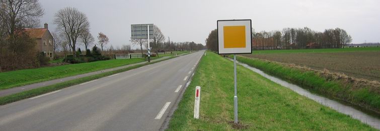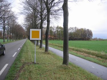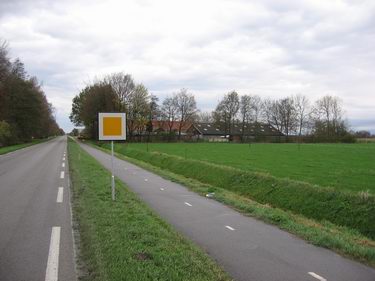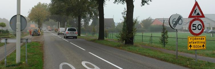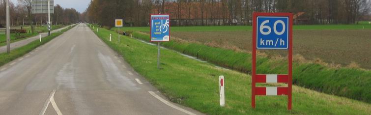 Slagharen: bordengegoochel op de Hoogeveenseweg Op 25 oktober werd er hard gewerkt aan de Hoogeveenseweg tussen de Drentse grens en Schuinesloot. Dat viel -ondanks de mist- op te maken uit de waarschuwingsborden en het bord (50). ![]() En dan -enkele decimeters verderop- een bord, dat de snelheidslimiet van 60 km/uur opheft.....! |