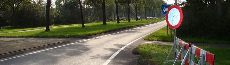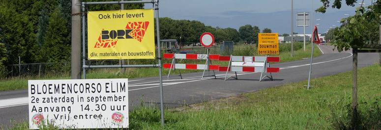 | Wie rond 20 augustus via de rotonde van het Krakeel de Weg om de Oost op wilde rijden om op het industrieterrein te komen, kon dat wel vergeten: pas enkele tientallen meters na de rotonde hadden Bob en Flop aan deze drukke toegangsweg een bord neergezet, dat duidelijk maakte, dat de weg (voor doorgaand verkeer?) afgesloten was. Ook hier dus volop plotselinge rempartijen op de rotonde en tientallen gefrustreerde (vaak zelfs pas bij het bord kerende) weggebruikers, die vooraf niet gewaarschuwd waren voor de afsluiting. |