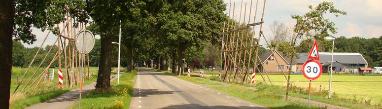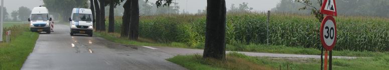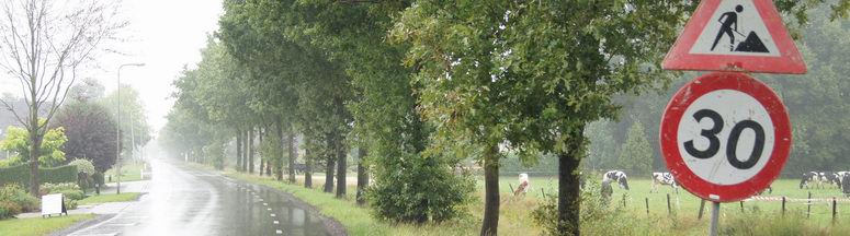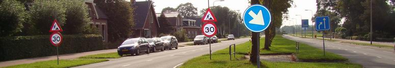 Voor alle veiligheid zetten ze borden neer, waardoor men nu in deze straat niet harder mocht rijden dan dertig kilometer per uur. Logisch, want wie wil er in deze 4.80 m brede kronkelstraat door snelheidsduivels van de sokken gereden worden ? Opmerkelijk was alleen, dat deze straat in een dertig-kilometer-per-uur zone ligt en het 30-bord dus volslagen overbodig was.... |