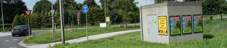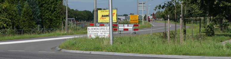 | Bovendien ontnamen een electriciteitshuisje en meerdere borden aan de rotonde het zicht op de schrikhekken op de Weg om de Oost, zodat de onaangename verrassing nòg onverwachter kwam. En tijdig een wegomlegging aangeven ? Dat is natuurlijk te veel gevraagd.... |