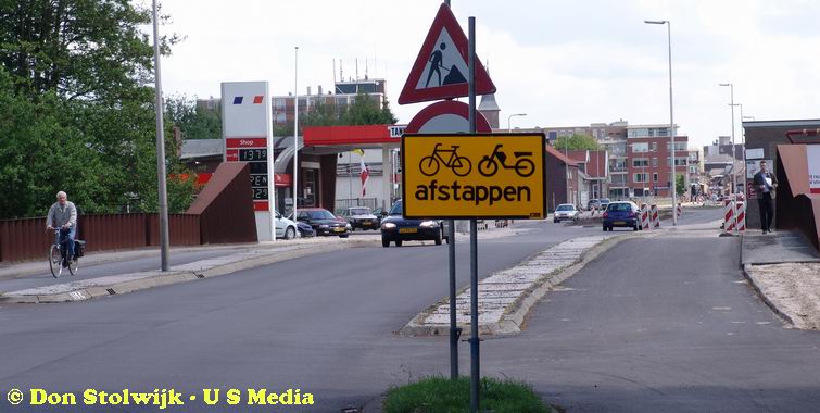 Eronder een groot geel bord, dat fietsers en bromfietsers tot afstappen maant.