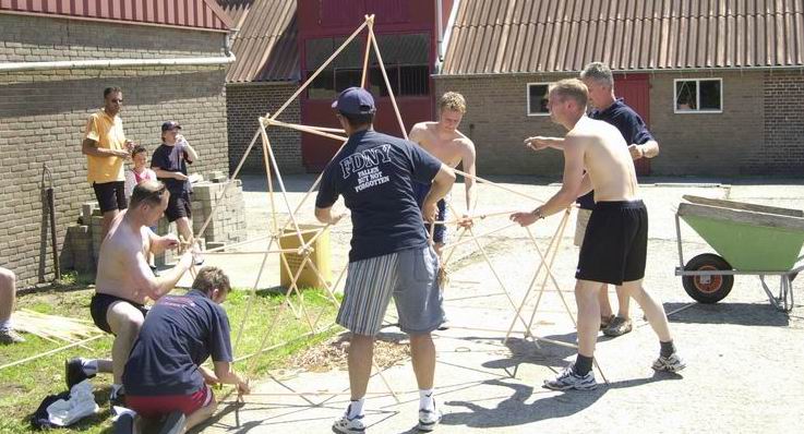 * Met vier geblinddoekte personen een zo gelijkzijdige vierkant vormen met een touw, zonder aanwijzingen van de omstanders
