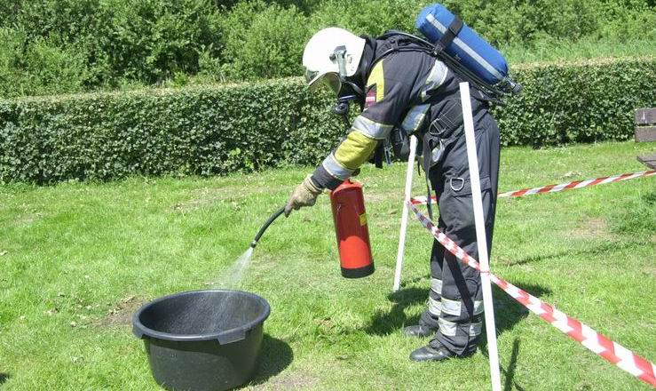 * Brandblusser vullen met water, op druk pompen en door een persoon met ademlucht over parcours lopen en blusser leegspuiten
