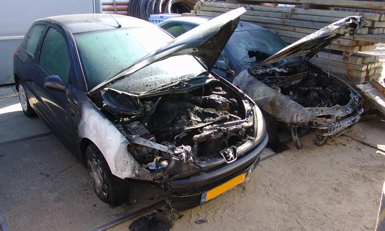 Beide auto's waren op dezelfde manier in brand gestoken, doordat er een brandend voorwerp op één van de banden gelegd was.