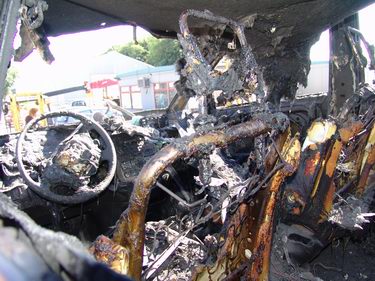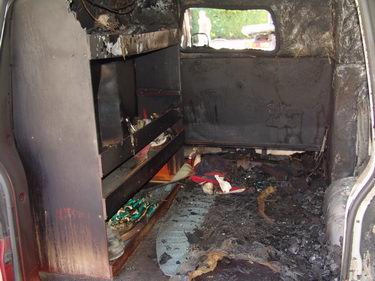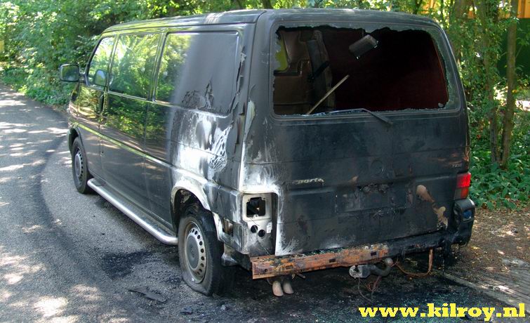 Onze theorie, dat de pyromaan het alleen voorzien had op zwarte auto's, ging hier in rook op: de Transporter was -ooit- rood.