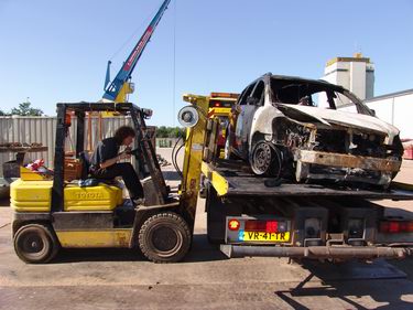 Het was een flink karwei, want deze wagen was volledig uitgebrand en de wielen weigerden elke medewerking.
