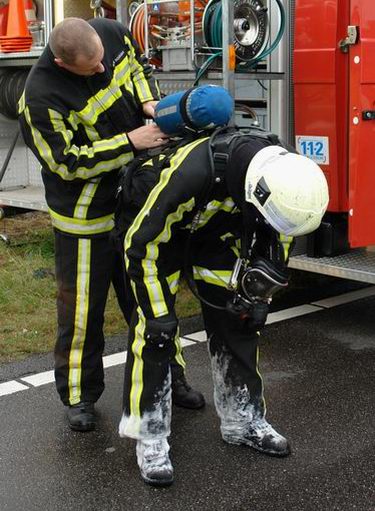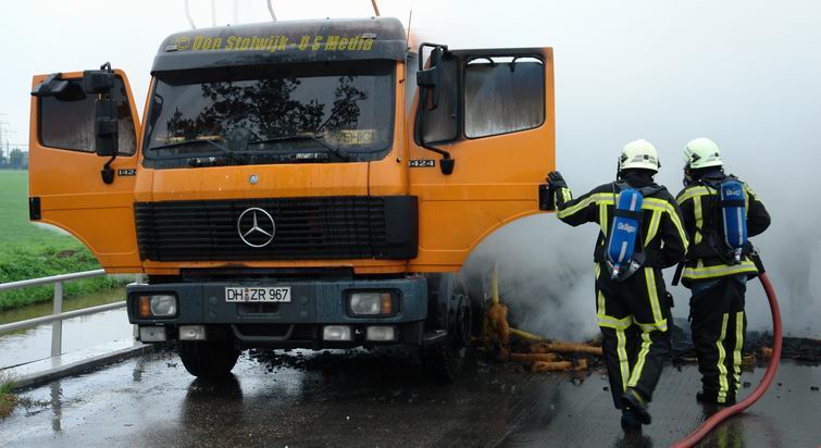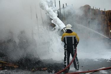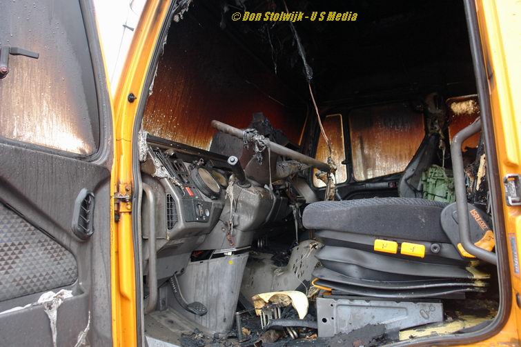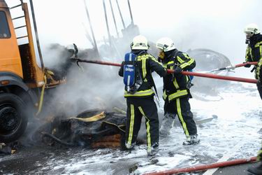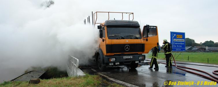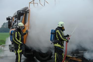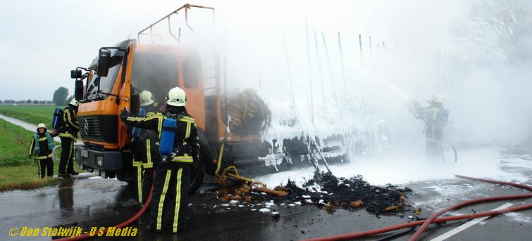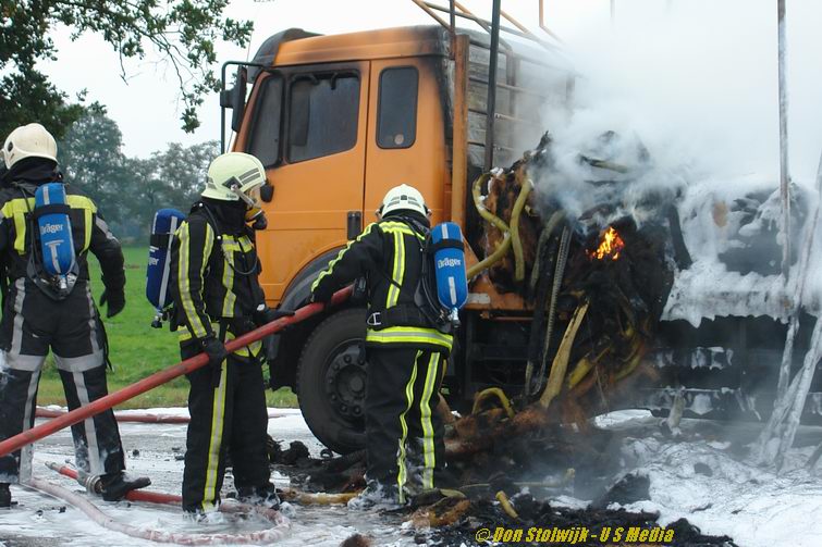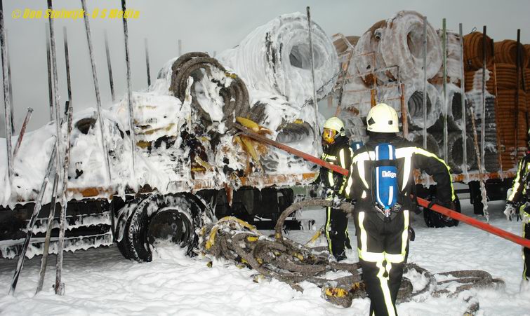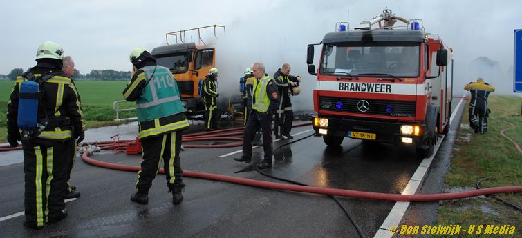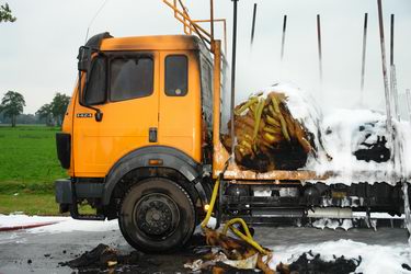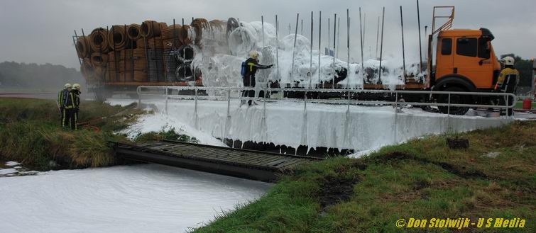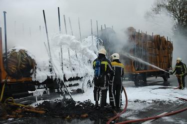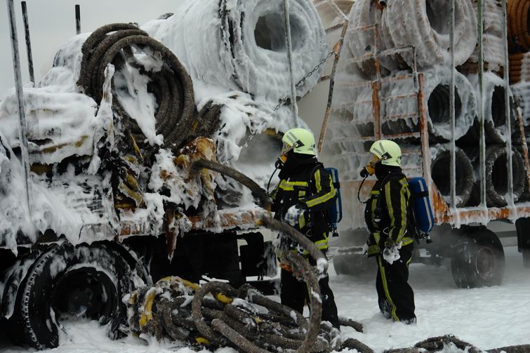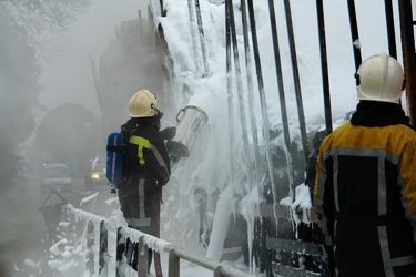 Winterse taferelen door schuimbluswerk brandende vrachtwagen