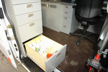 In de wagen bevinden zich een bureautje, maar ook enkele kasten met schuifladen, die allerhande benodigdheden bevatten.