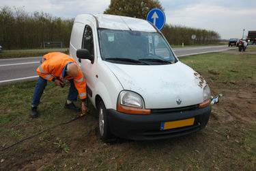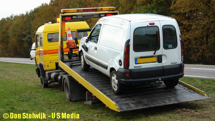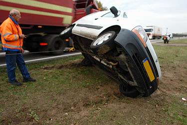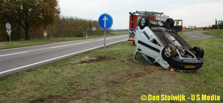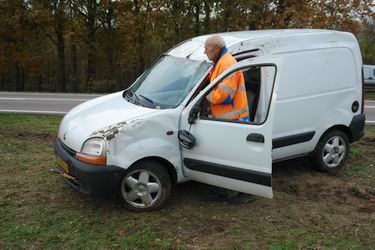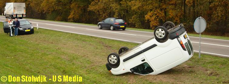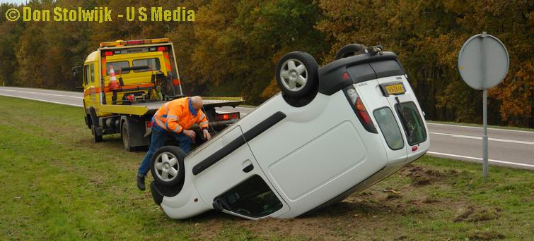 Bestelauto over de kop na rem- en uitwijkmanoeuvre