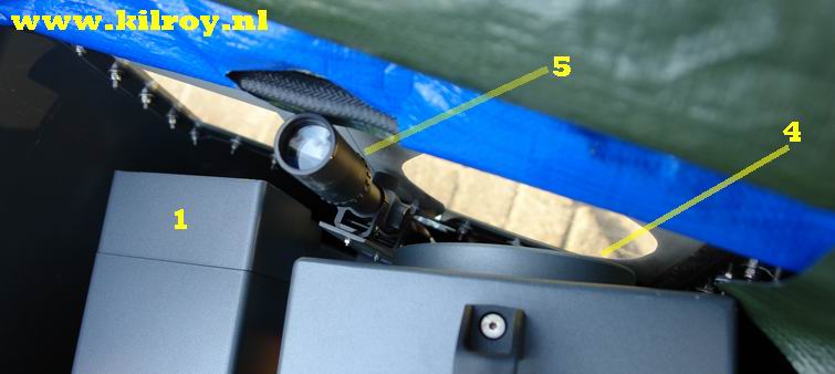 5), dat in de bak verticaal aan de voorkant vastgeschroefd zit.
